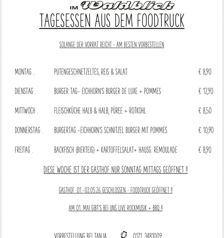 Unsere TAGESESSEN im Foodtruck bieten Ihnen von Montag bis Freitag (11.30-14.00 Uhr) eine abwechslungsreiche Wochenkarte, die mit frischen, saisonalen Zutaten zubereitet wird. Jeden Tag können Sie ein neues Gericht entdecken, das sowohl traditionelle als auch moderne Aromen vereint. Von herzhaften Burgern und bunten Salaten bis hin zu gutbürgerlichen traditionsgerichten und köstlichen veggie Optionen – bei uns ist für jeden Geschmack etwas dabei. Lassen Sie sich von unseren wöchentlich wechselnden Gerichten überraschen und genießen Sie ein kulinarisches Erlebnis auf die Hand!